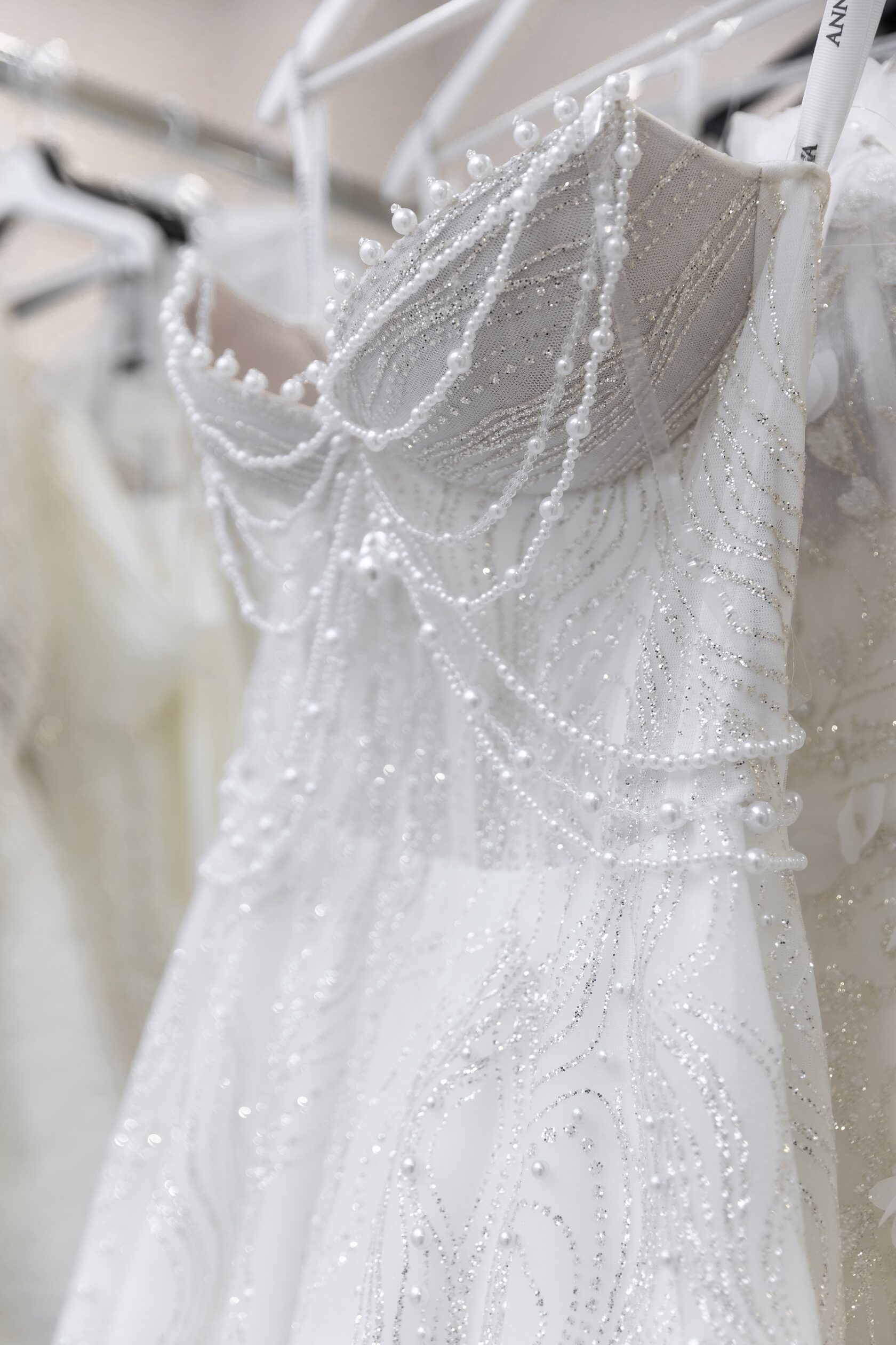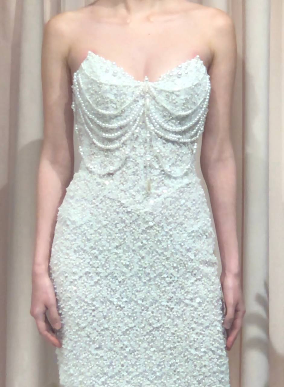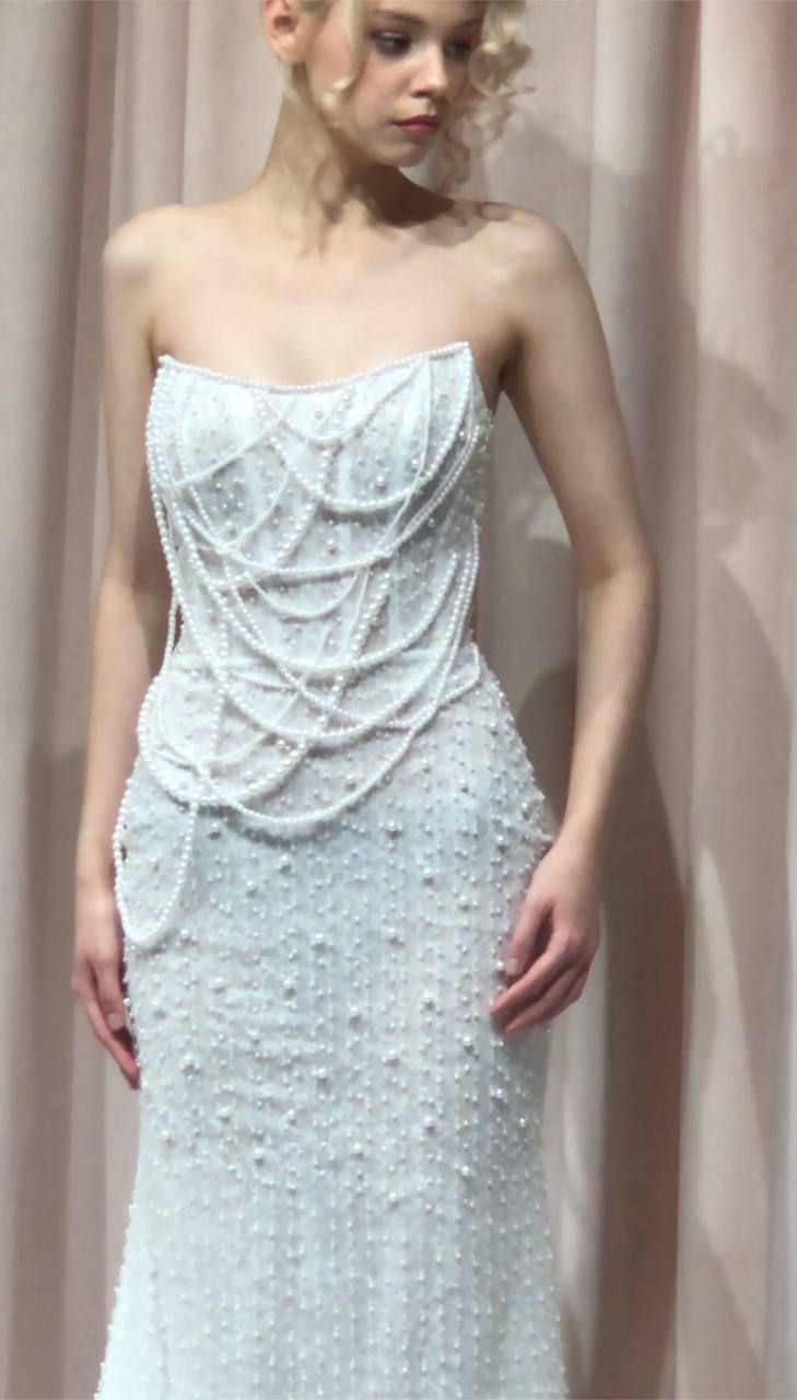 Жемчуг становится одним из ключевых акцентов новой коллекции. Он используется в различных форматах: от расшитых жемчугом платьев до жемчужных бретелей и нитей на лифе. Дизайнеры экспериментируют с размерами и формами жемчуга, включая грушевидные элементы, которые придают образу утонченность и элегантность.