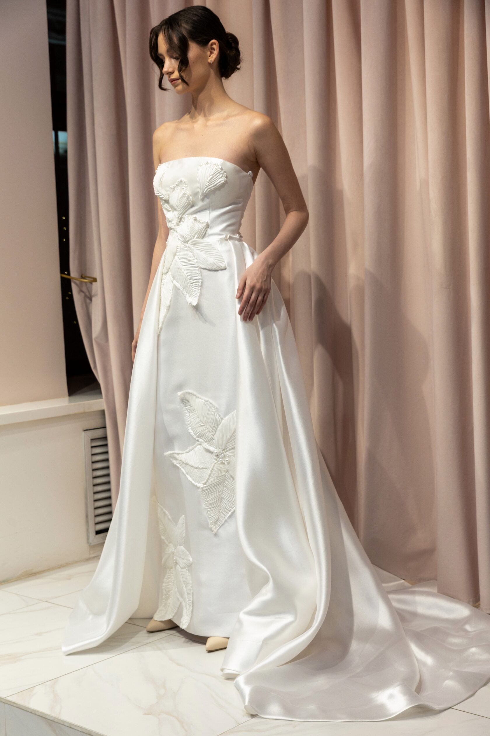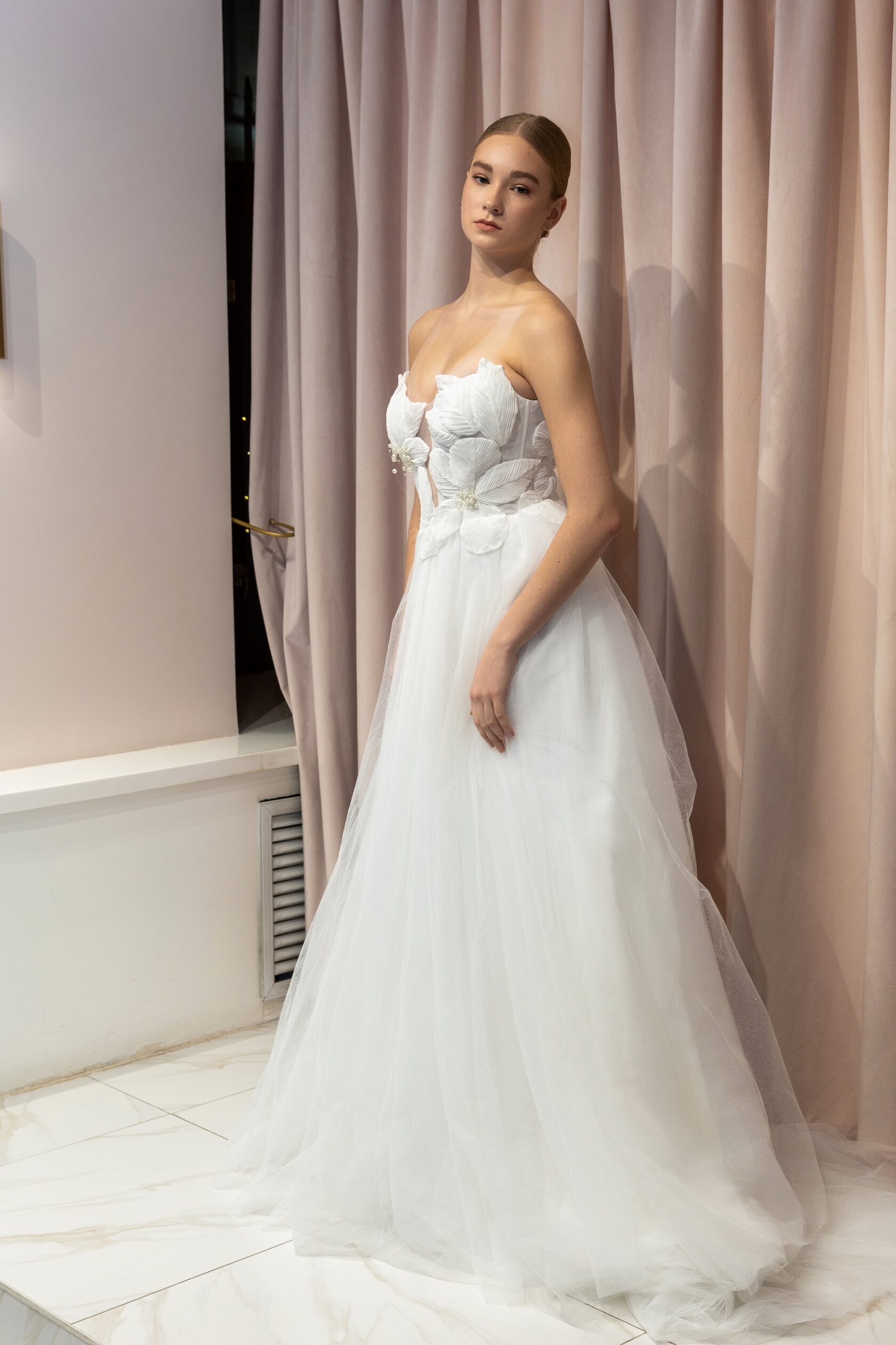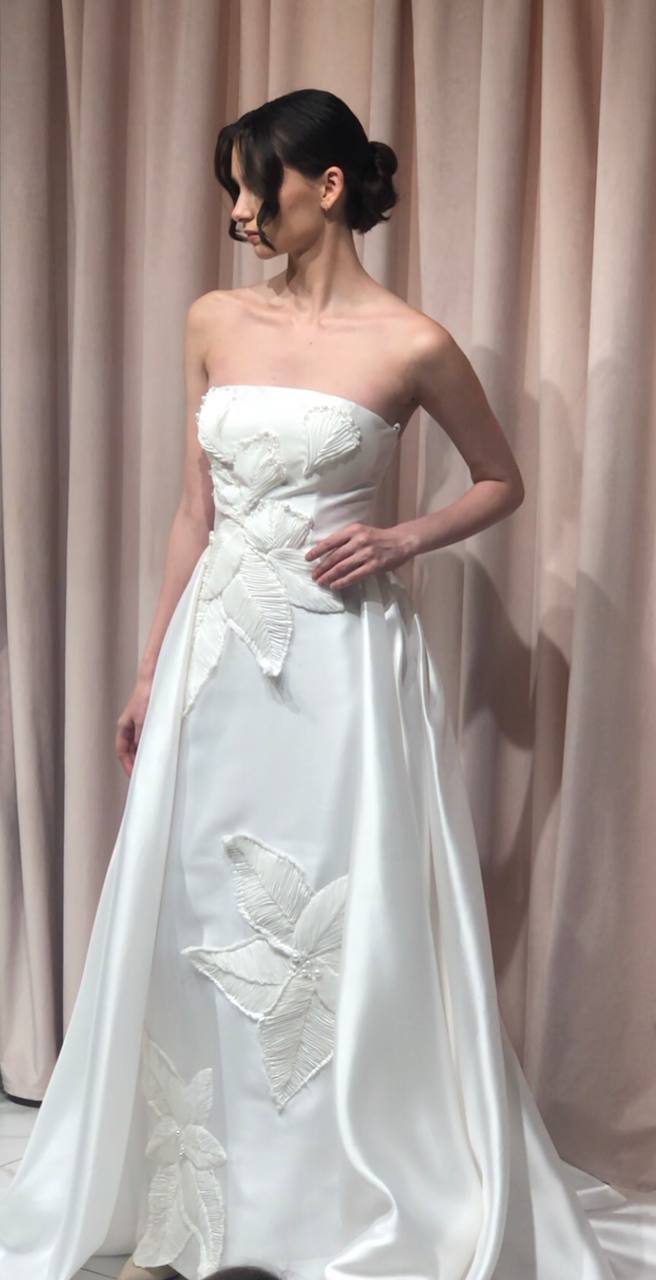 Цветочные мотивы вновь становятся актуальными. Они могут быть как на корсете, так и на юбке, а также служить съемным элементом для смены образа. Цветы из различных тканей — как легких и воздушных, так и плотных — добавляют платью романтики и игривости, позволяя невесте легко менять стиль в течение дня.